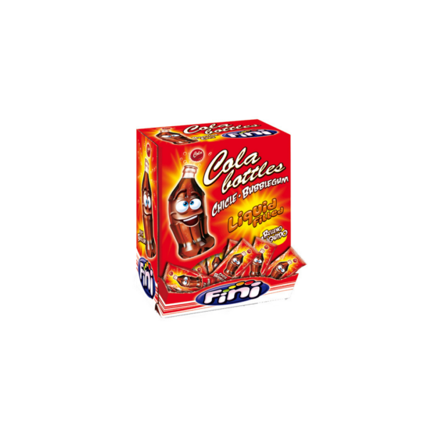 Chewing gum with form of a cola bottle and cola liquid filled. Each piece is wrapped individually. Box of 200 pieces.